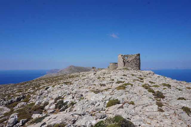 Hogy megéri-e a nehézségeket, nem is kérdés. Ezek a bizonyos egészségügyi fujtatások is kellemes környezetben történnek (kiváló kilátással Lagkadára, Tholariára és az egész Aegali-öbölre), fent pedig majd már azért áll meg az ember egy helyben, hogy semmi se vonjon el energiát a látvány befogadása elől. Szélmalom-romok itt is vannak bőséggel, a kilátásról pedig lásd a poszt közepét, ahol kifejtettem már ezt alaposan szigetvilágilag is.